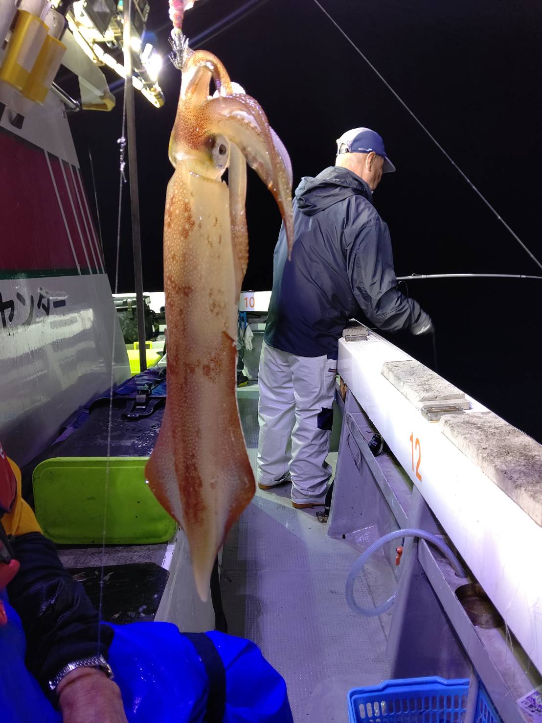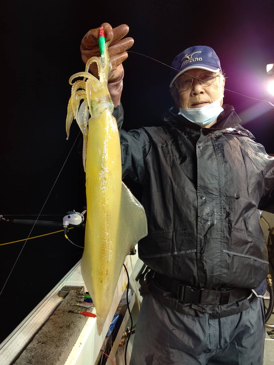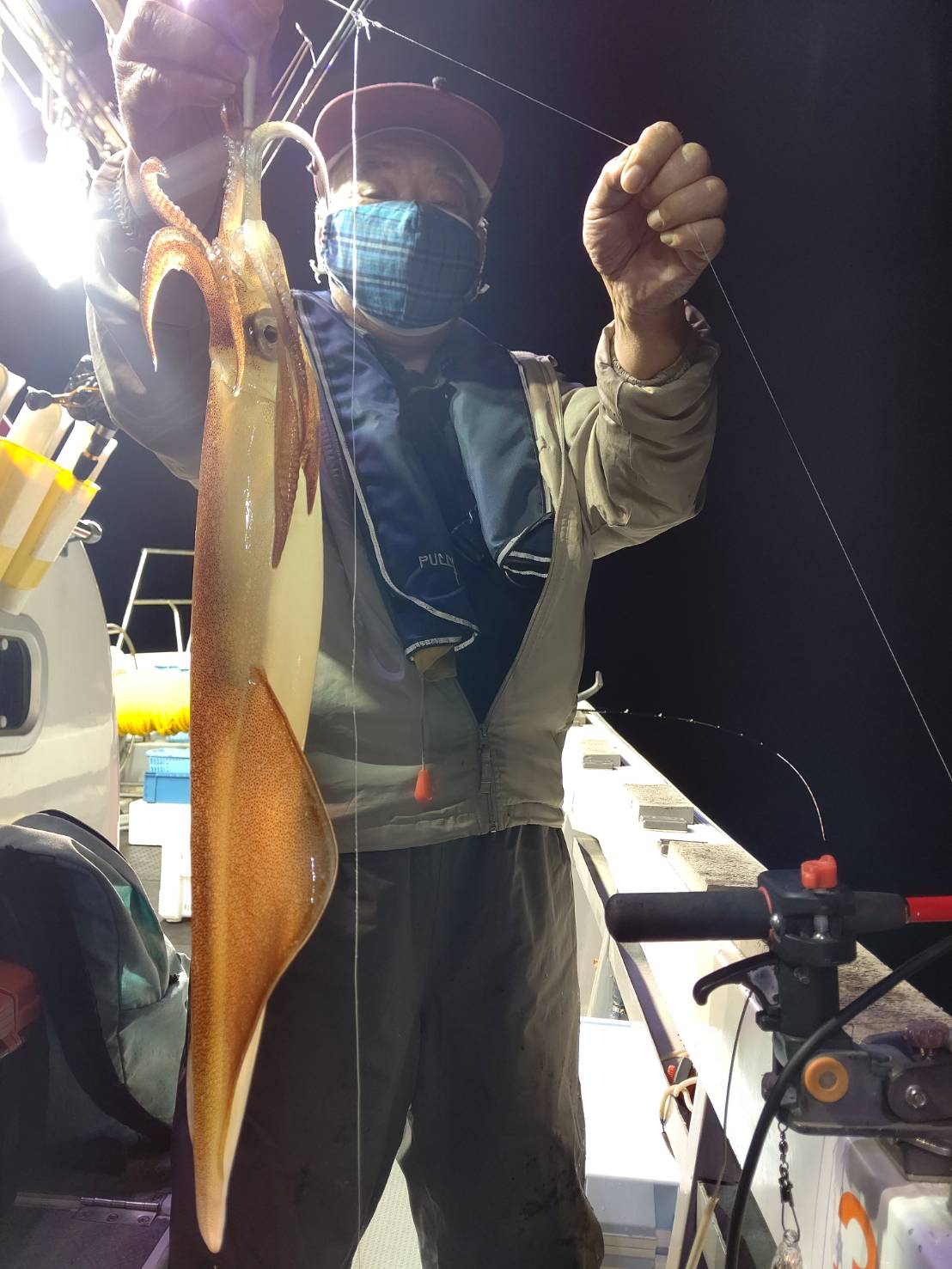 いざポイントへ☆着いてみて、少し潮が速かったのでパラシュートでの流し釣りでした。点灯前マイカ、ムギイカと顔見れた程度でした(*^^*)点灯後一時間位からポツポツとムギイカ、たま~にマイカが釣れました♪でもそんなに勢いがなかったです。水面にムギイカの群れが、最後減灯してポツポツあたりましたが、イカはいるのに!そこに見えるのに!なかなか釣れない~(ノ_<。)イカも賢いなぁ(笑)それでも竿頭57ハイ!次の方も49ハイと良かったです♪ほとんどの方が30パイ前後とその内マイカは1~2割位でした(≡^∇^≡)