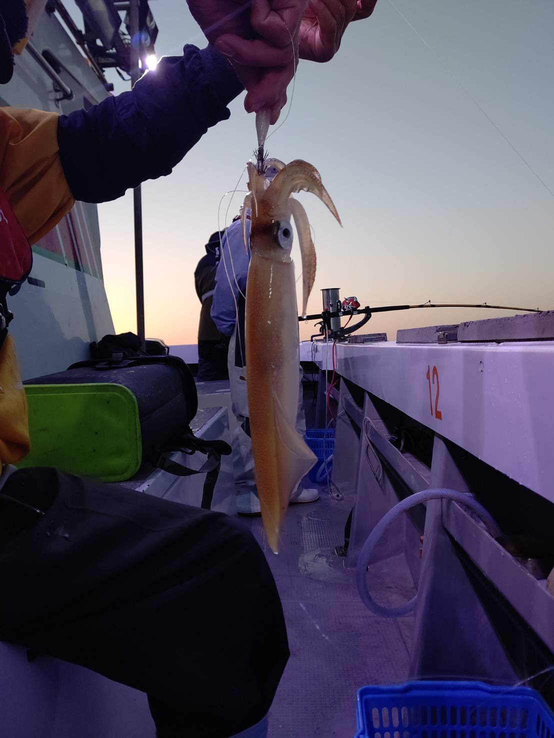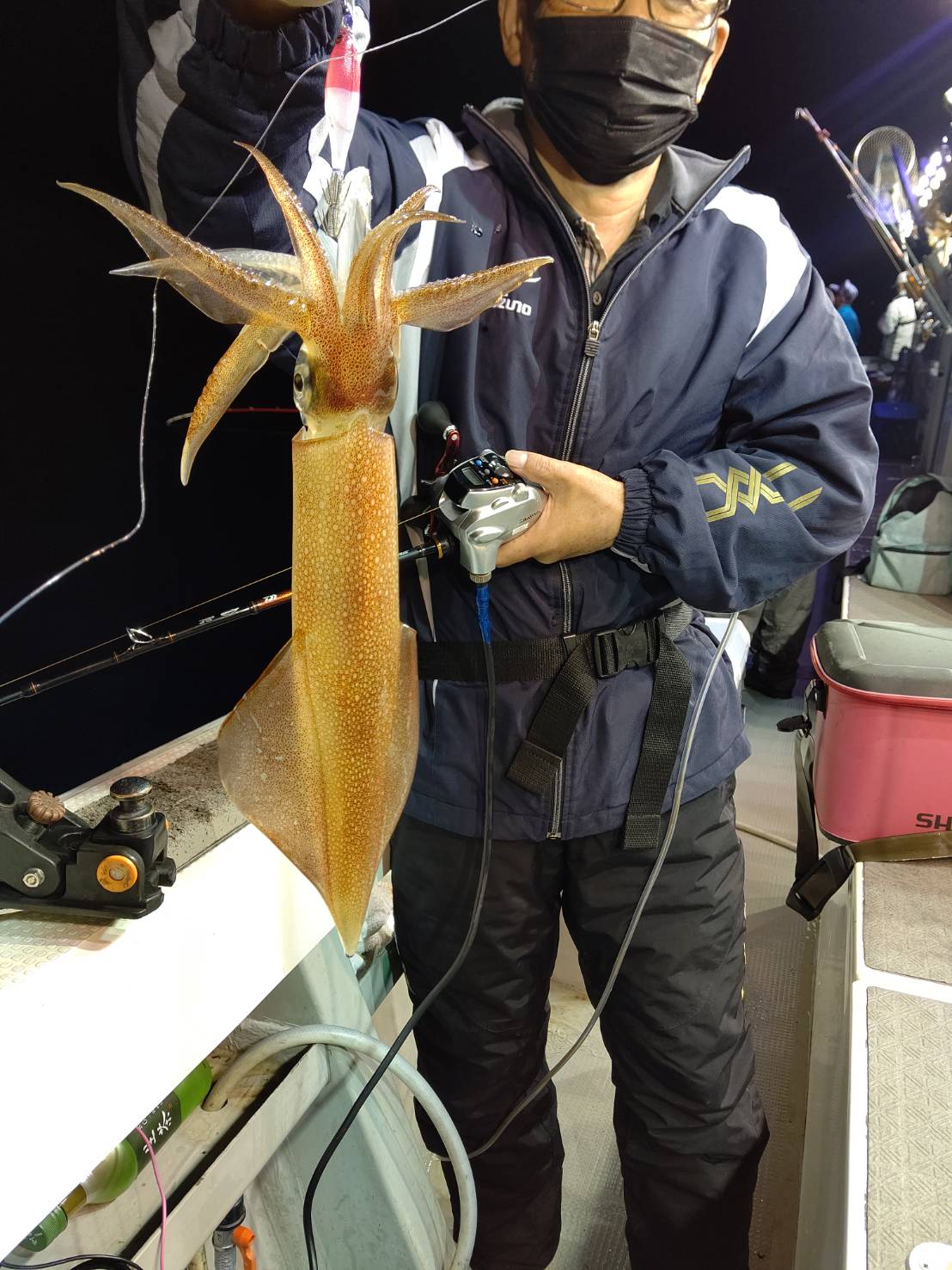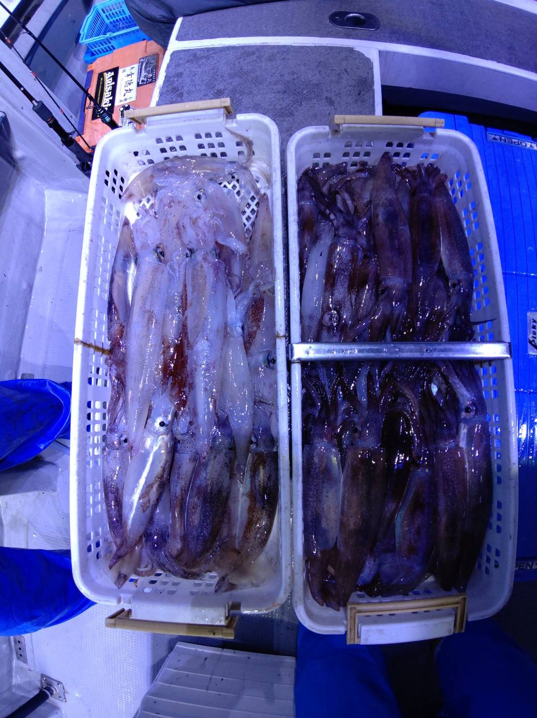 いざポイントへ☆着いてみて、少し潮が速かったのでパラシュートでの流し釣りでした。点灯前マイカ、ムギイカと顔見れた程度でした(*^^*)点灯後一時間位からポツポツとムギイカ、たま~にマイカが釣れました♪でもそんなに勢いがなかったです。水面にムギイカの群れが、最後減灯してポツポツあたりましたが、イカはいるのに!そこに見えるのに!なかなか釣れない~(ノ_<。)イカも賢いなぁ(笑)それでも竿頭57ハイ!次の方も49ハイと良かったです♪ほとんどの方が30パイ前後とその内マイカは1~2割位でした(≡^∇^≡)