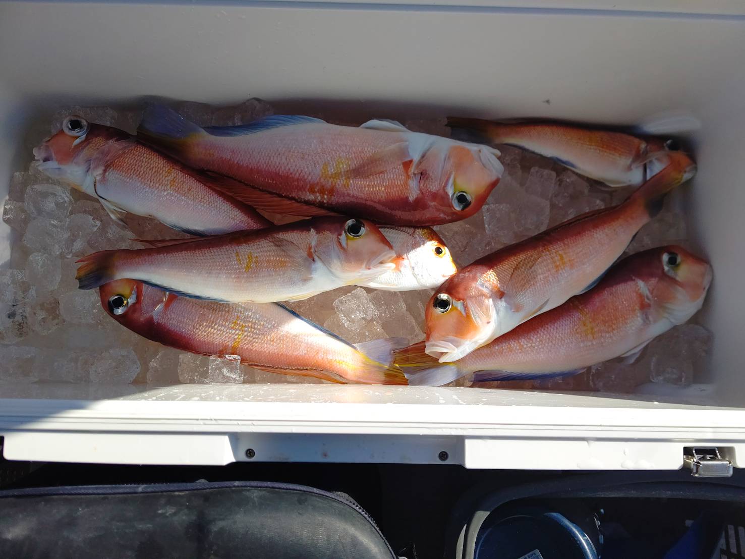 流して流して一匹、一匹アマダイを釣りました。時合いのない魚です。根気良く頑張って、、いつ、、、釣れるかわからない魚です(笑)でも、天気もよくくも1つない気持ちのいい1日でした♪今日は、みなさん差がありつつも、全員がアマダイの顔見れて何よりでした(≧▽≦)竿頭の稲垣さん7匹GET!お見事でした(*^▽^*)本日は福井美浜米春丸に、ご乗船下さいまして誠にありがとうございましたm(__)m明日も頑張って出船します!