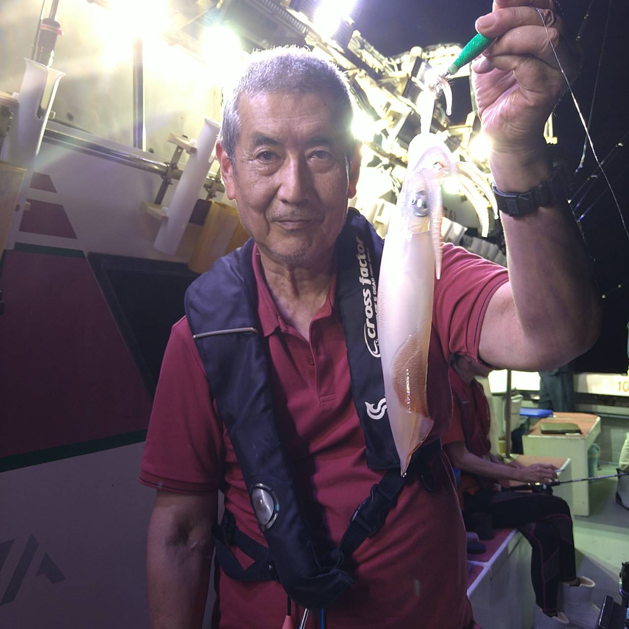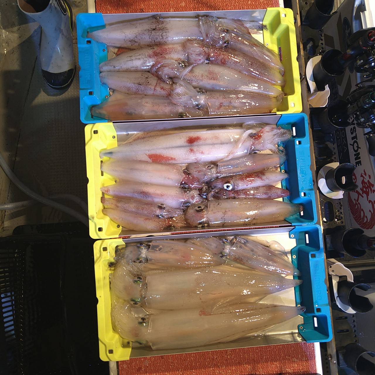 今日は強烈な二枚潮でした。ぐるぐるまわって少しでもやりやすいポイントでやりました。タナが深い分おまつりからは逃れません。PE0.6号までドロッパー2号まで鉛25号、タングなら20号が必需品です!PE0.8号は使えません。他のお客さんに迷惑になるので必ず確認して下さい。よろしくお願いしますm(_ _)m 点灯してからポツンポツンとタナがバラバラで釣れました。正直釣れません!お客さんが釣ってくれる感じです。最近は特に技あり釣果です。暑い中最後まで頑張ってもらいました(*^^*)竿頭スルメ少し混じって25ハイでした!チャンピオンステッカーGETおめでとうございます( /^ω^)/♪♪ 次の方で23バイとほとんどマイカでした♪♪本日は福井県美浜米春丸にご乗船下さいまして誠にありがとうございましたm(_ _)m