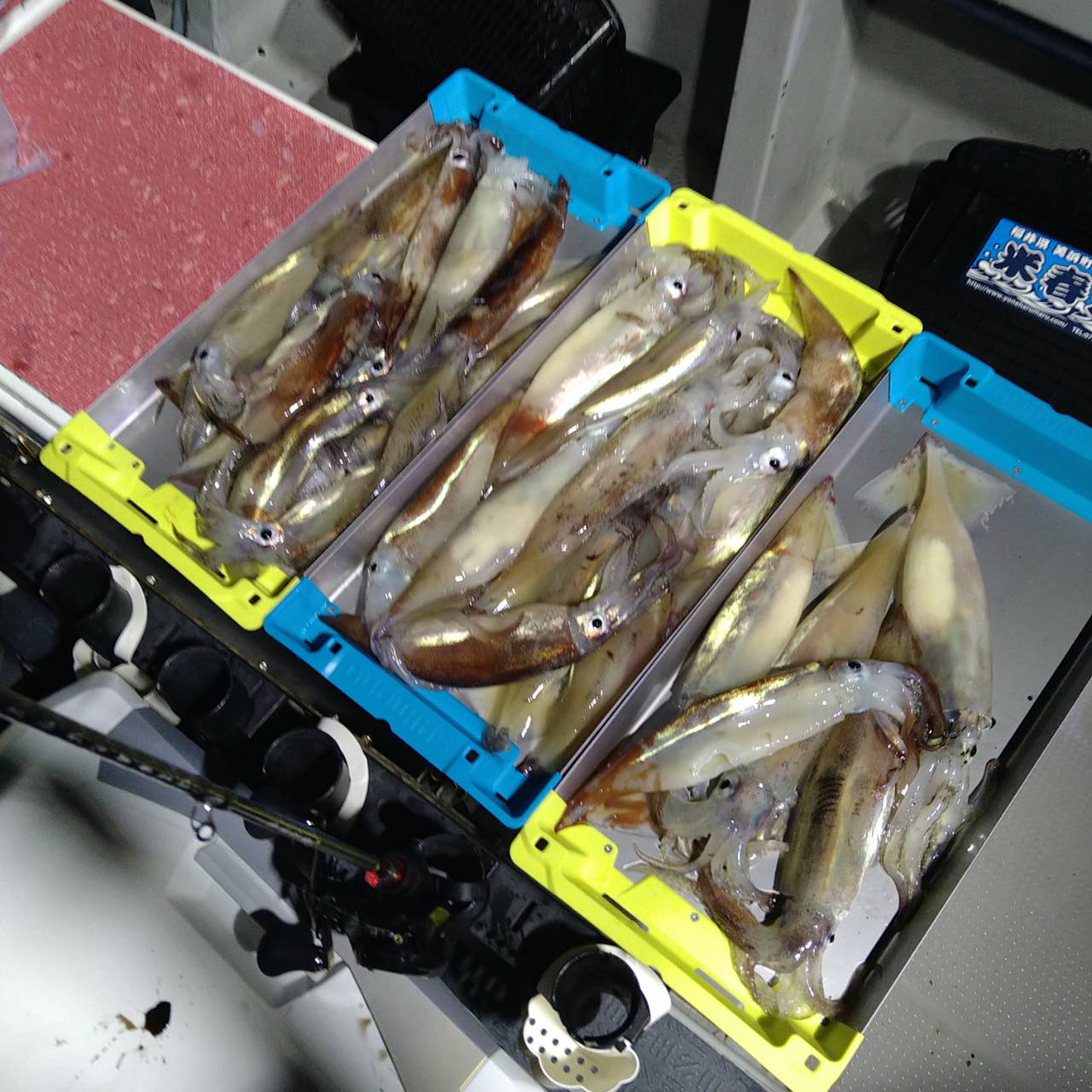 今日は沖合へ。少し潮ありでした。点灯してから少し待ち時間ありましたが、スルメがポツポツと釣れました♪少し間がありましたが、あたると何人かがヒット(^ー^)!サバ、フグの邪魔もありましたが退屈しない分ありがたいです。後半マイカの顔も見れました(=^ェ^=)何やかんやで8割の方が10パイオーバーお土産確保出来ました\(^-^)/竿頭21パイが2名様と良かったです。カラーチェンジしたチャンピオンステッカーGETおめでとうございます(*^ω^)ノ本日は、福井県美浜米春丸にご乗船下さいまして、誠にありがとうございましたm(_ _)m