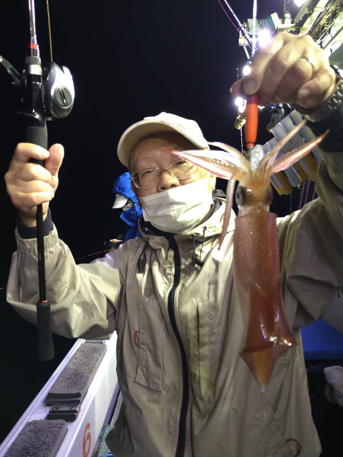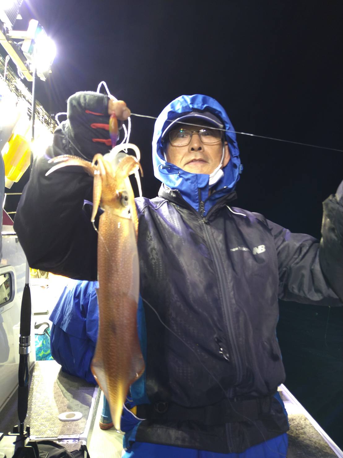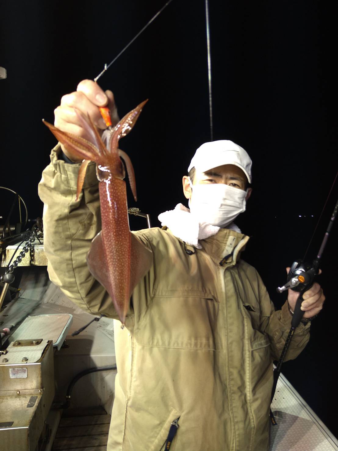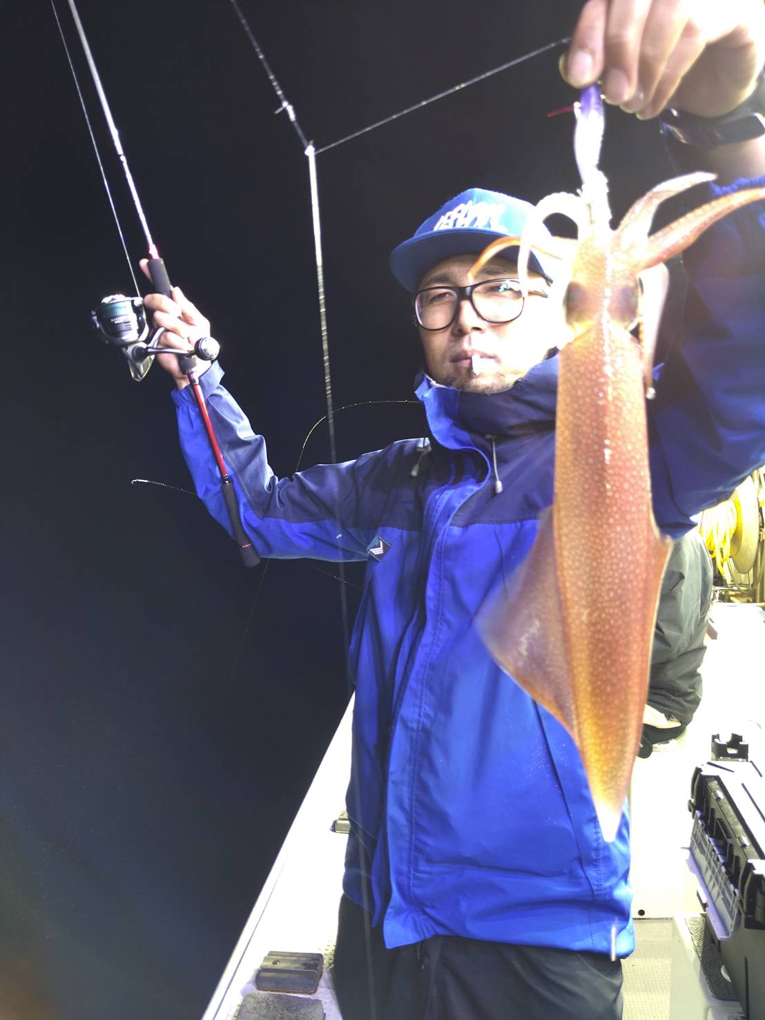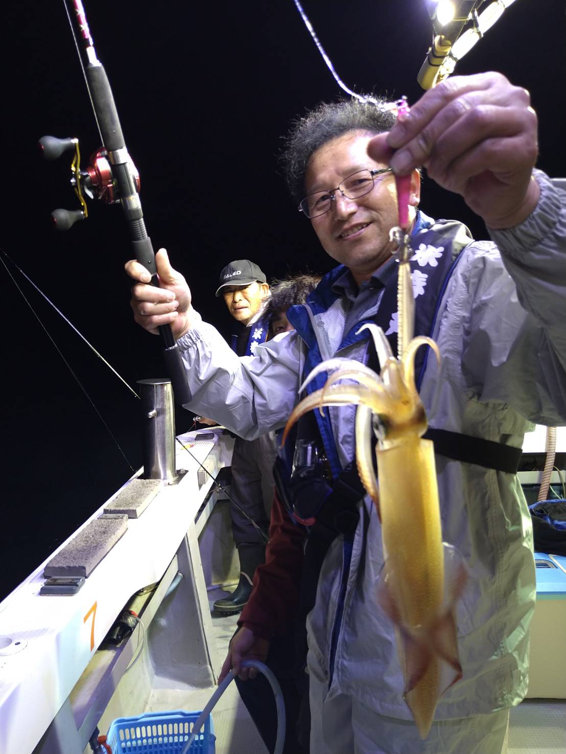 今日は点灯してからポツポツと最近にしてはいい感じでした♪潮もなくカカリ釣り。棚が深いのでやはりたま〜におまつりありです。なかなか活性は上がらないので個人差出ますね〜。その日のラッキーカラーもあります(^ー^) 今日は、オレンジ、ピンク系が良かったです(^^)d マイカ竿頭浅野さん19ハイ、橋本さん、野村さん同数17ハイ、清水さん16パイの良型でした(*^▽^*) 計10パイ超え7名とスルメも良く釣れてました★良かったです\(^-^)/本日は福井美浜米春丸にご乗船下さいまして誠にありがとうございましたm(_ _)m
