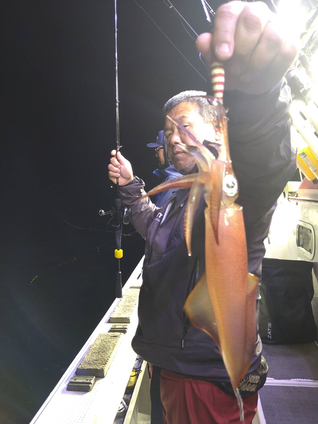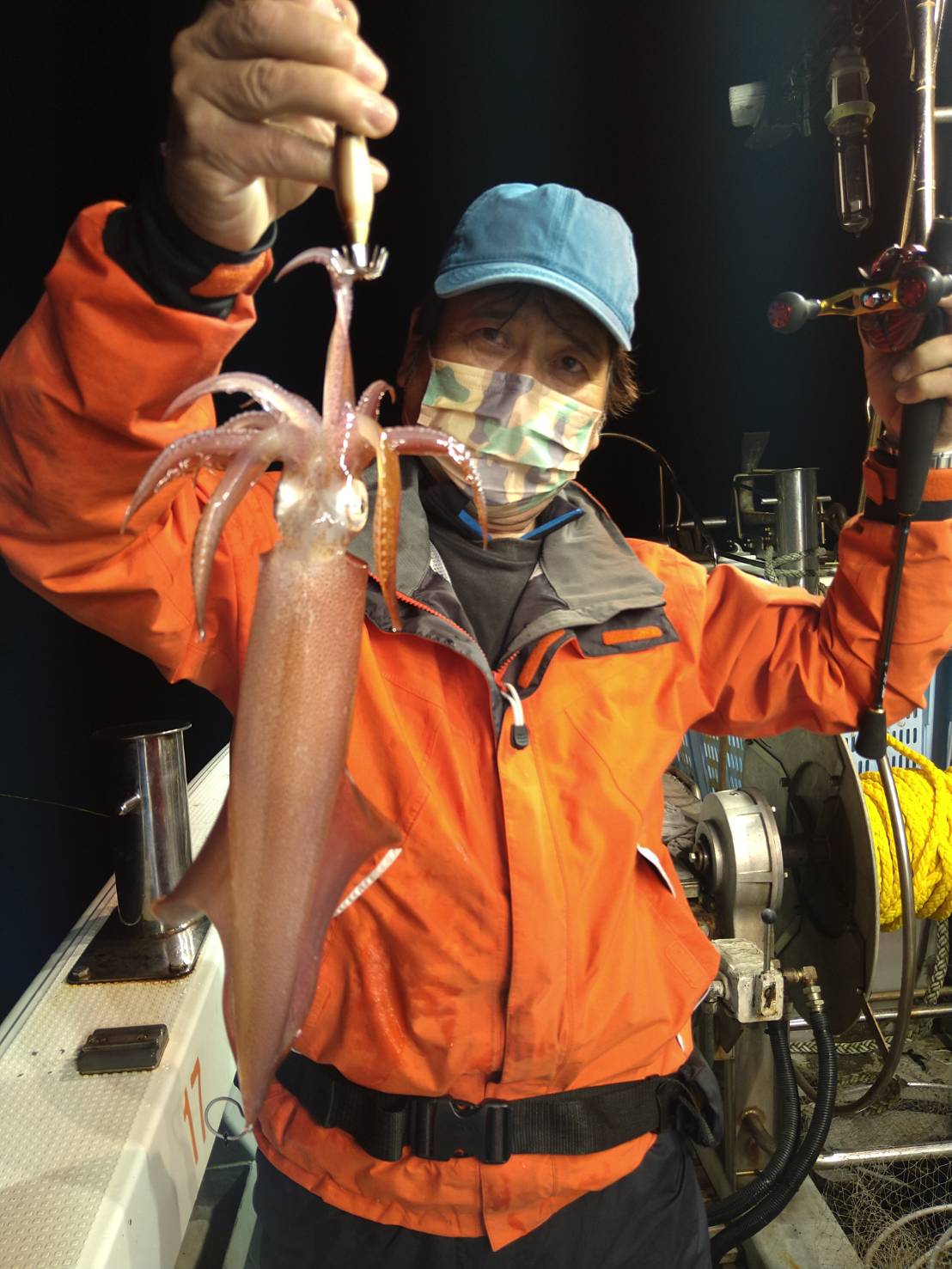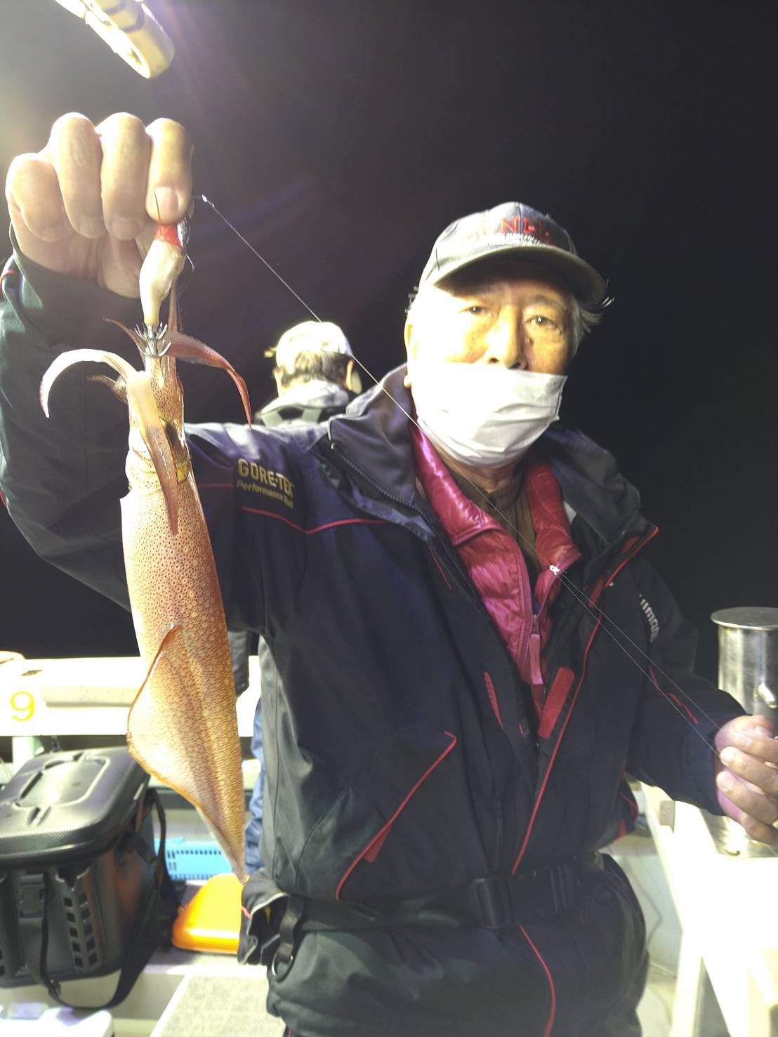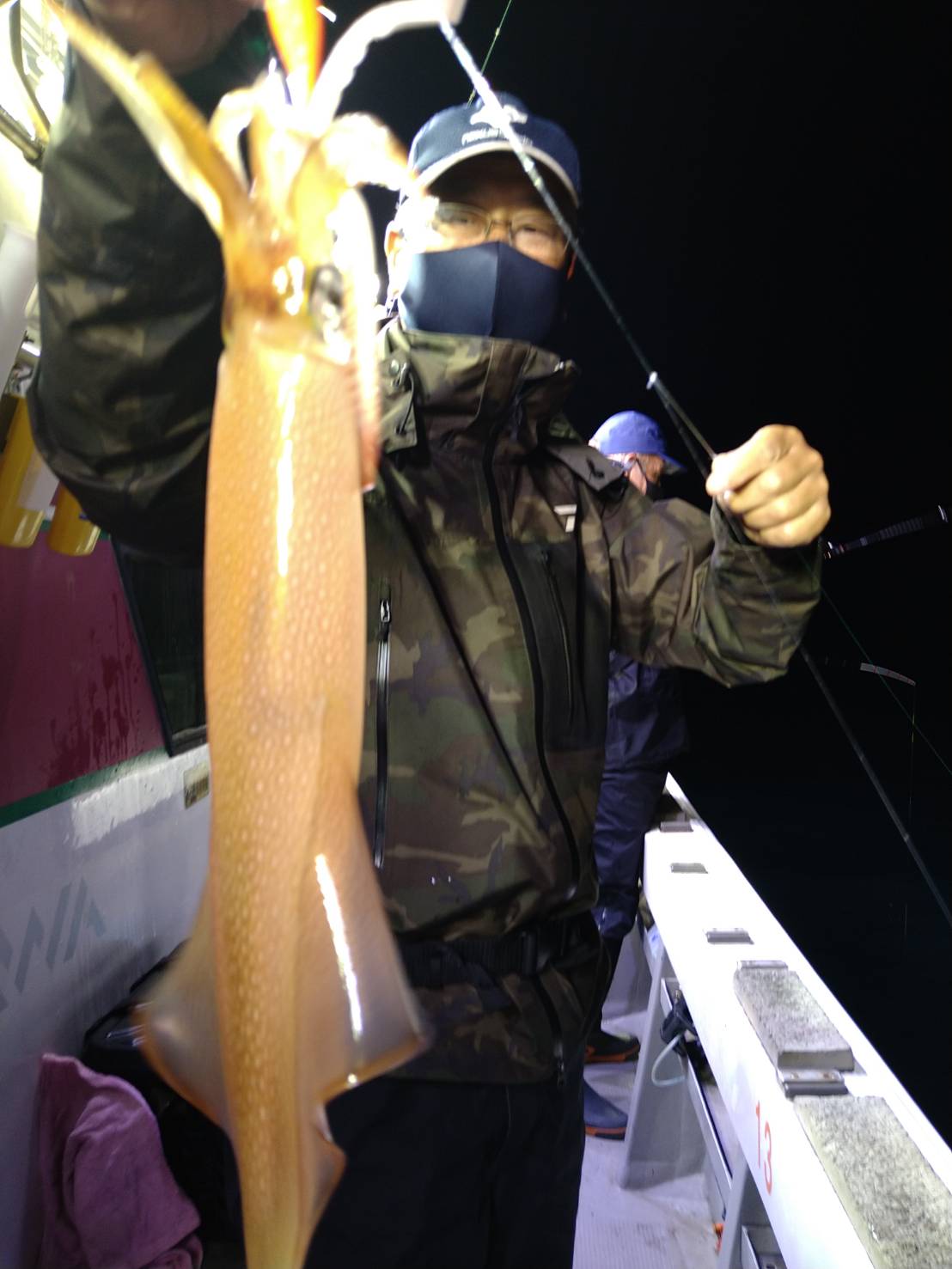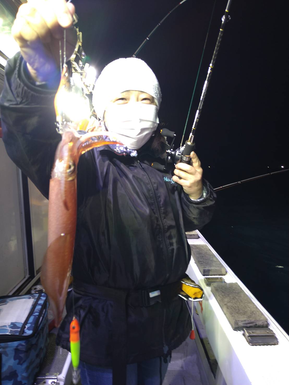 今日は点灯してからポツポツと最近にしてはいい感じでした♪潮もなくカカリ釣り。棚が深いのでやはりたま〜におまつりありです。なかなか活性は上がらないので個人差出ますね〜。その日のラッキーカラーもあります(^ー^) 今日は、オレンジ、ピンク系が良かったです(^^)d マイカ竿頭浅野さん19ハイ、橋本さん、野村さん同数17ハイ、清水さん16パイの良型でした(*^▽^*) 計10パイ超え7名とスルメも良く釣れてました★良かったです\(^-^)/本日は福井美浜米春丸にご乗船下さいまして誠にありがとうございましたm(_ _)m